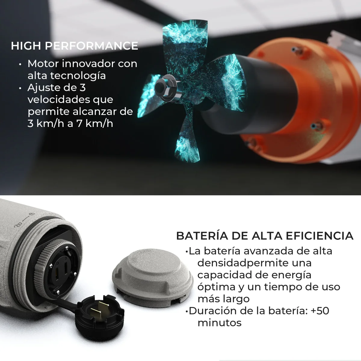 El diseño integrado de motor, hélice y formato de cono convierte a este propulsor en una opción de alto rendimiento.