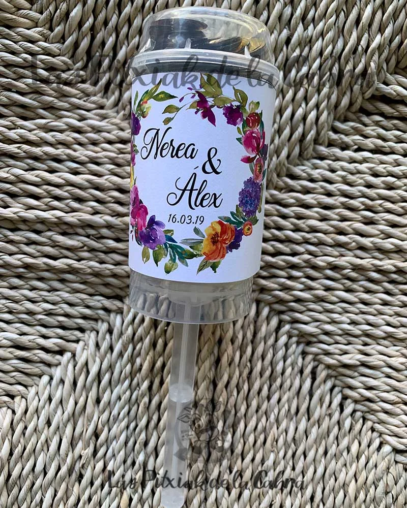 Push pop de confeti. Mide 48 x 180 mm en total. El diseño se puede hacer totalmente personalizado. Podemos hacerlo a juego con cualquier cosa de las que tenemos en la tienda online. Solo tienes que comentarlo en el apartado reservado de personalización.