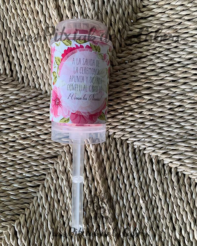 Push pop de confeti. Mide 48 x 180 mm en total. El diseño se puede hacer totalmente personalizado. Podemos hacerlo a juego con cualquier cosa de las que tenemos en la tienda online. Solo tienes que comentarlo en el apartado reservado de personalización.