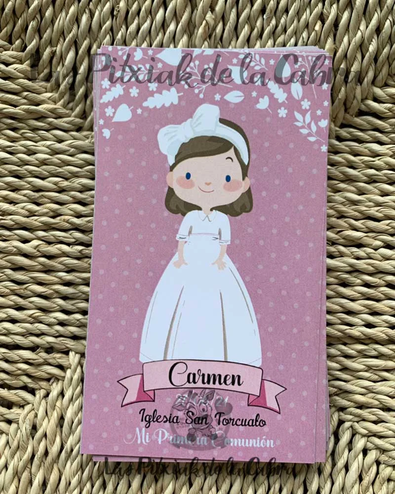 Este es el modelo de Recordatorio comunión Carmen mide 140x82mm y está impreso en papel de 350 grs.