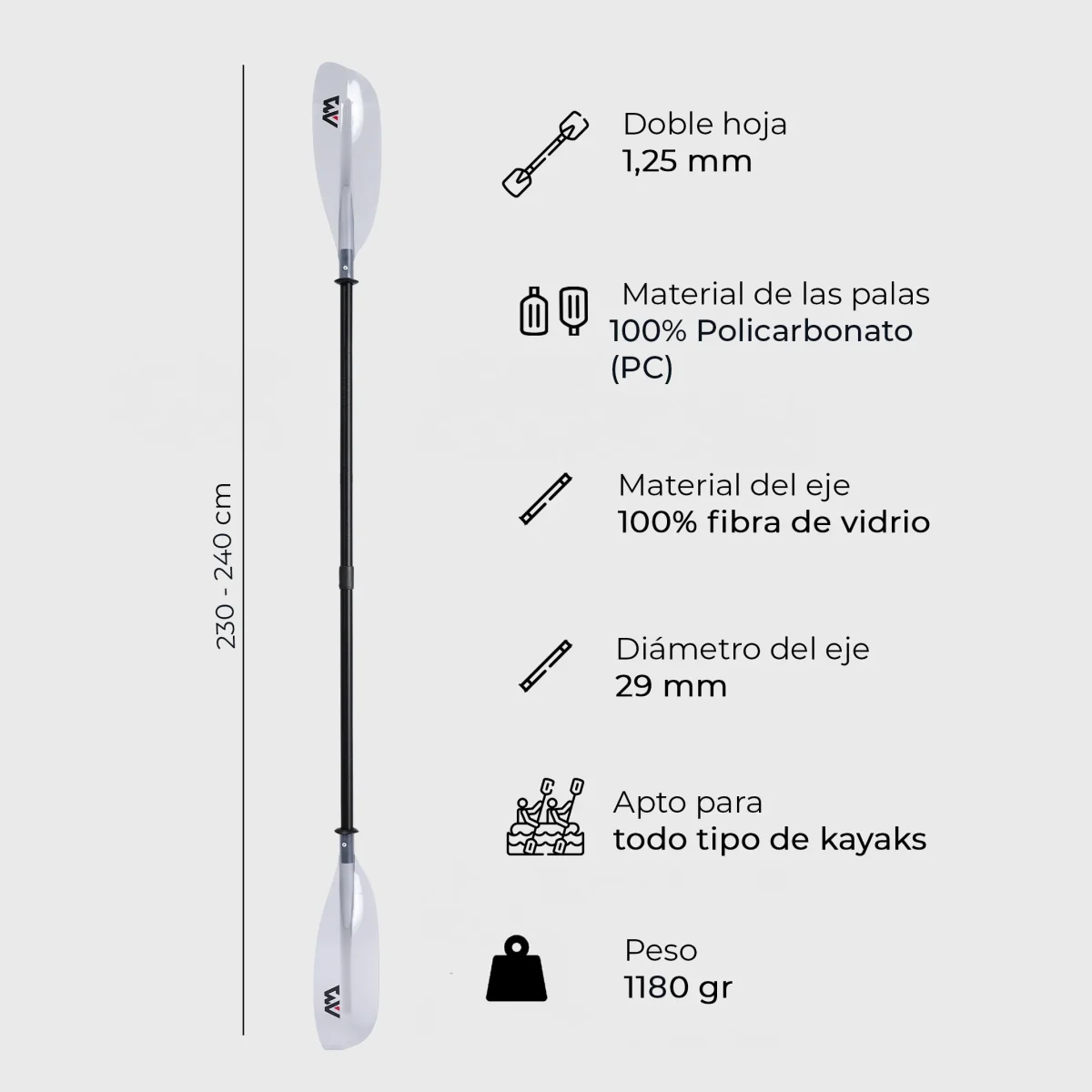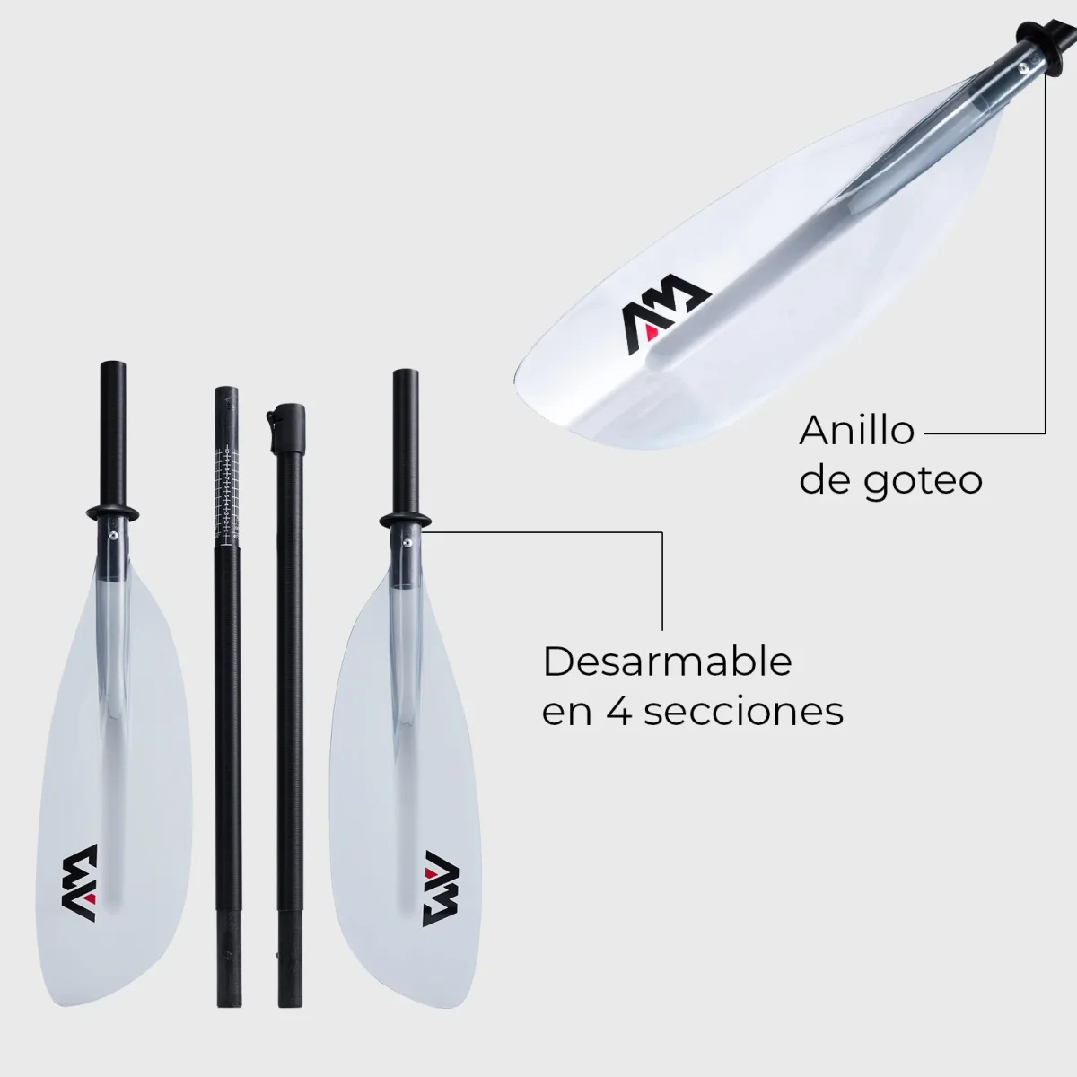 El Remo para Kayak KP-2 by Aqua Marina de fibra de vidrio es apto para todo tipo de kayaks y está pensado para ser fácil y práctico de transportar. Se separa en 4 partes y se arma muy fácilmente para acompañarte en tus aventuras por el río, lago o mar. Cuenta con doble hoja transparente de Policarbonato.