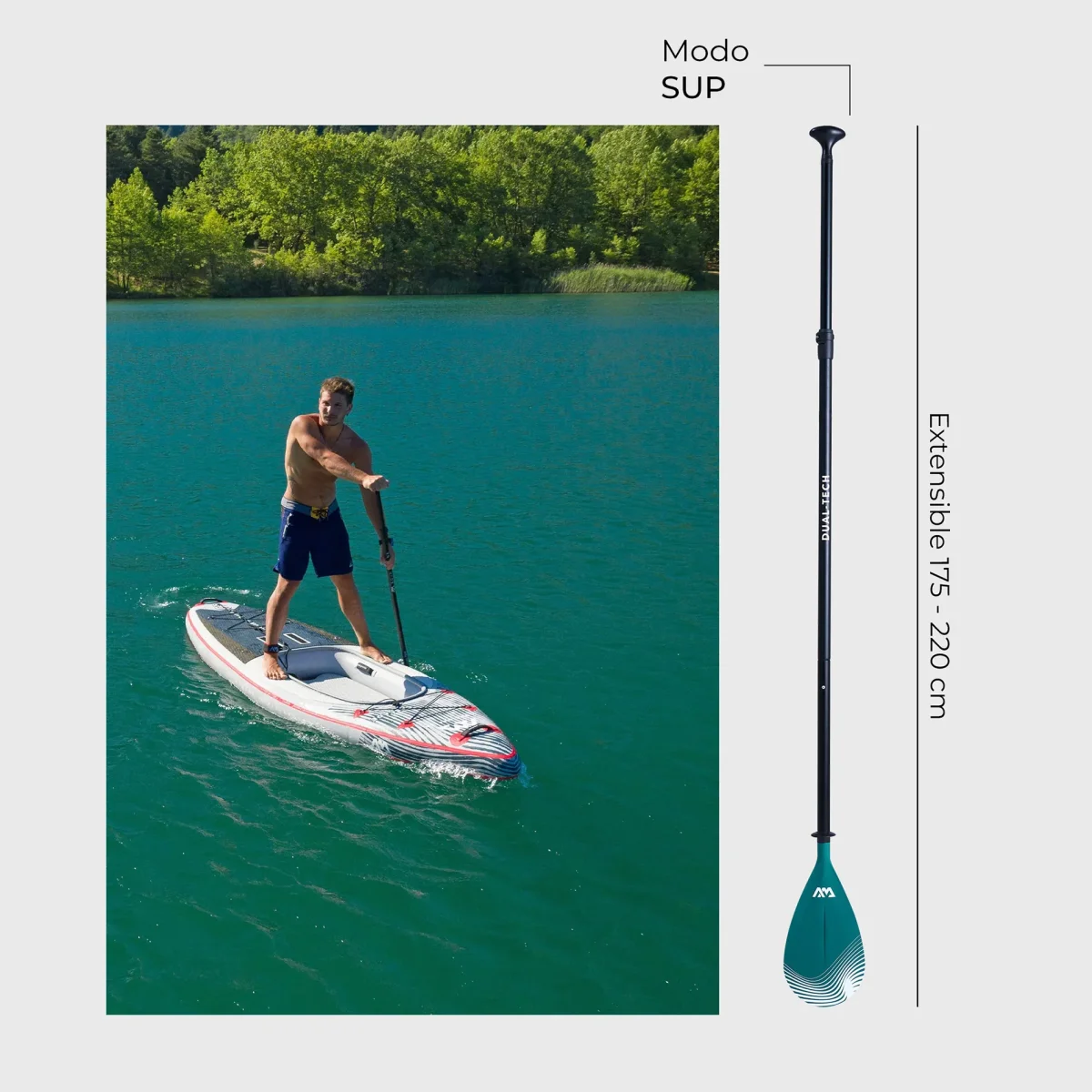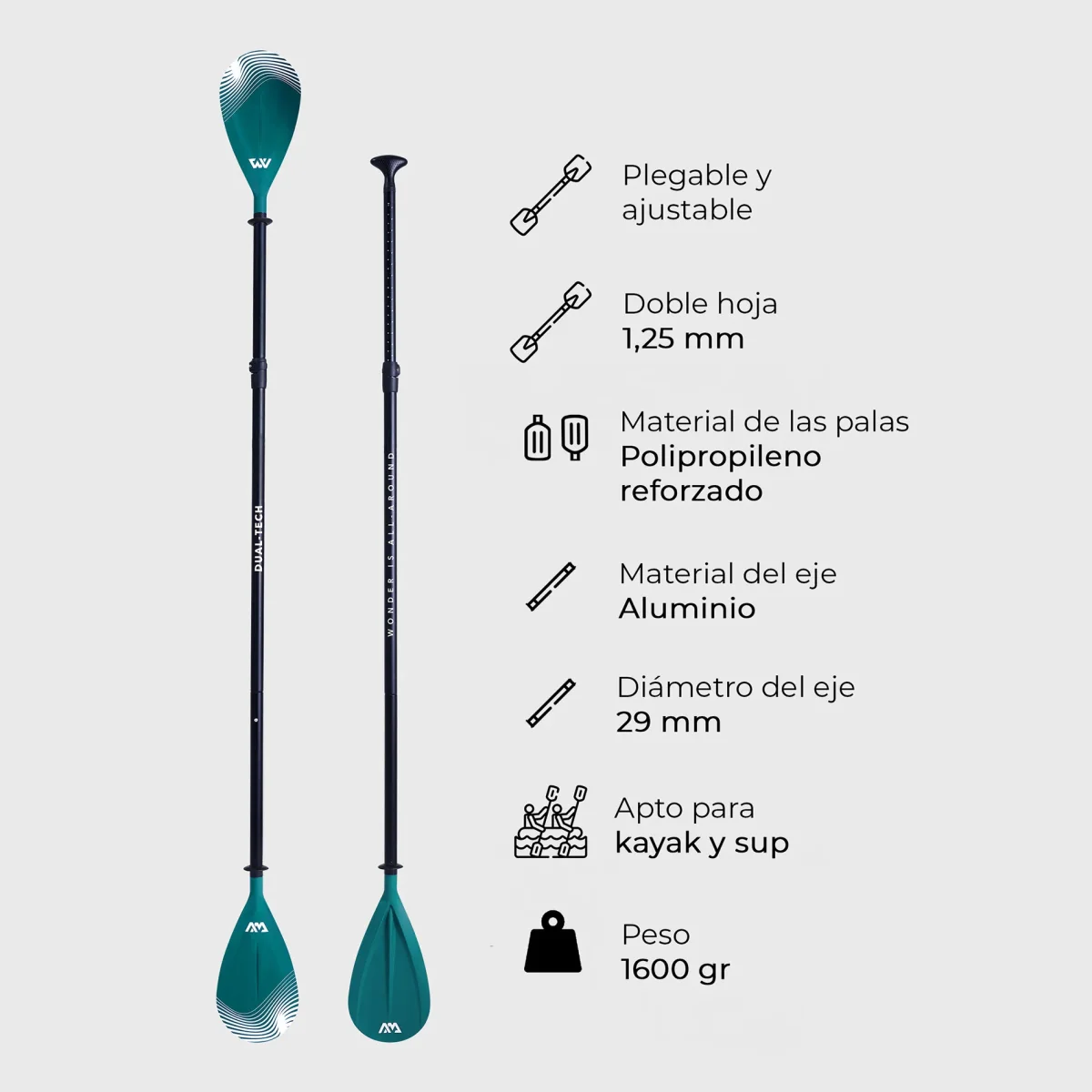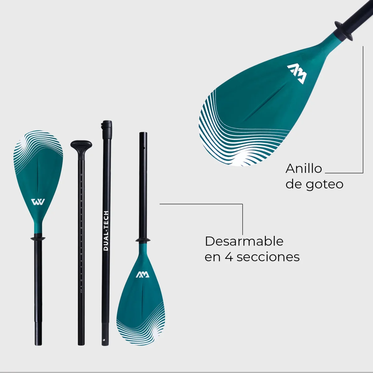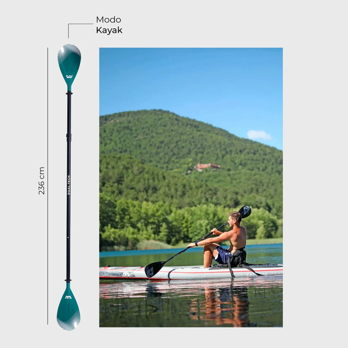 El Remo DUAL TECH by Aqua Marina es plegable y desarmable. Sirve tanto para SUP y como para Kayak ya que está diseñado con tecnología Dual Tech que se adapta a ambos deportes, quitando una de las paletas. Además está fabricado con poliestireno reforzado, lo que ofrece resistencia y durabilidad.