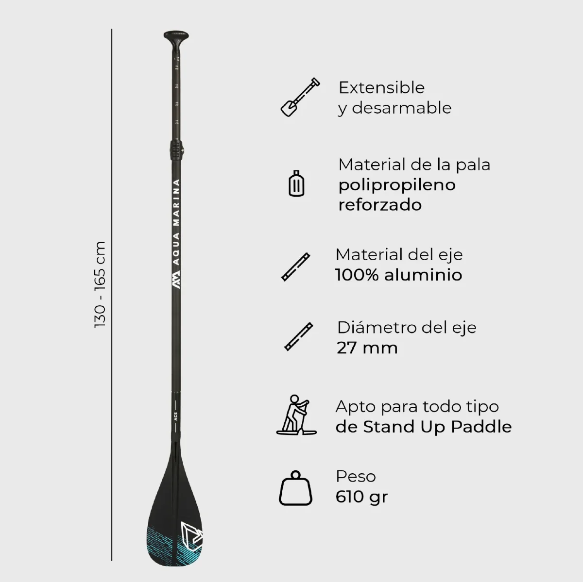 - Longitud: 51,2”-65” (130-165 cm), 3 secciones.