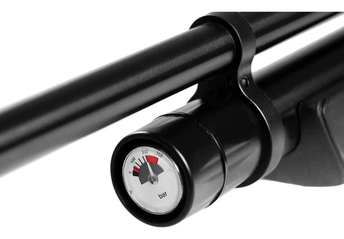 Una carabina de PCP con caño fijo, estriado de acero, martilleado en frío para una máxima precisión, gatillo regulable y seguro de disparo manual. Tiene una culata agresiva y ergonómica, en fibra, de color negra, perfecta para un encare rápido y excelente y una empuñadura marcada tipo pistola, para un agarre supremo en cualquier posición de disparo.