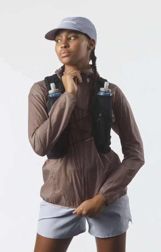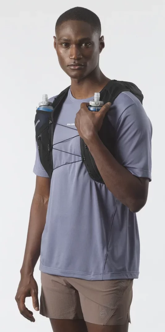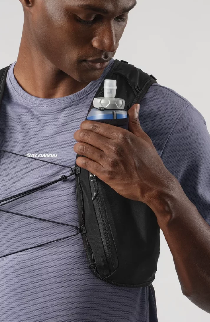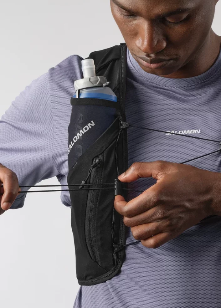 - 2 bolsillos frontales para bidones: Compatibles con los bidones blandos de Salomon, estos bolsillos frontales limitan el rebote. Las presillas elásticas superiores protegen los bidones y los ponen a tu disposición para beber.