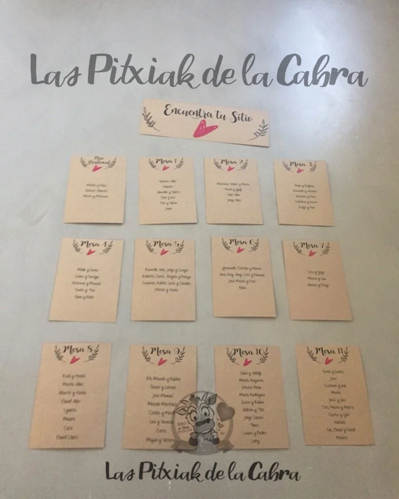 La primera vez que hicimos este seating fue para Marta, ella nos contó su idea, quería un diseño en papel kraft y con el logo de su boda y según lo que ella nos decía, fuimos creando cada zona.