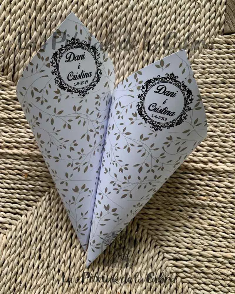 Los conos para pétalos son conos grandes de aproximadamente unos 20 cm. y van impresos en papel de 300 gramos a una sola cara. Los enviamos completamente montados, listos para colocar donde queráis ponerlos. Los conos son ideales para llenar de pétalos para tirar en la ceremonia, pero también podéis llenarlos de confeti, arroz o para pueden valer para vuestra mesa dulce.