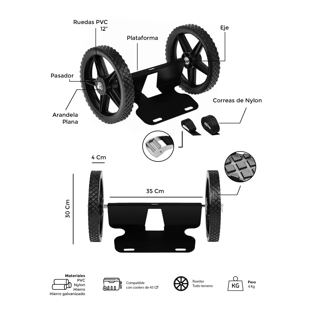 Transporta tu cooler sin complicaciones con el Set de Ruedas para Coolers de 45Qt by Kano. Este kit hace todo el trabajo pesado y te permite trasladar tu cooler sin esfuerzo en la playa, camping, parques, viajes de pesca y prácticamente en donde quieras. Solo tienes que ajustarlo a tu cooler y salir!