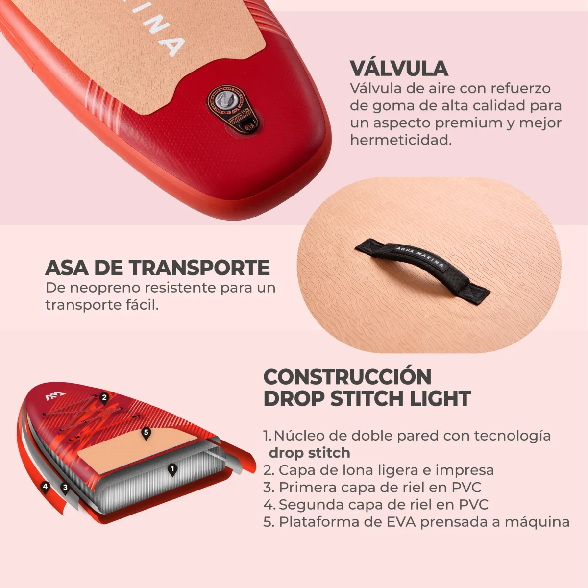 - Válvula de aire reforzada con goma de alta calidad para un aspecto premium y mayor hermeticidad, se infla rápidamente y con poco esfuerzo.