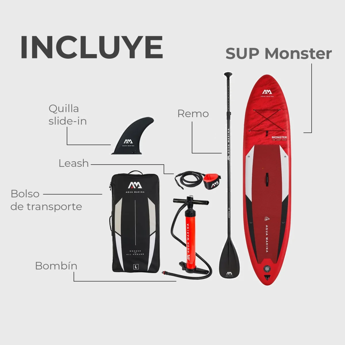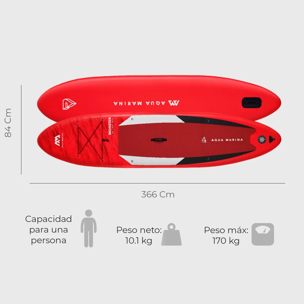 El Stand Up Paddle Inflable MONSTER by Aqua Marina presenta un volumen y una carga útil más generosos que se adaptan a quienes buscan un viaje más fácil y llevan más equipaje. La cómoda almohadilla ranurada en forma de diamante proporciona un agarre adicional, mientras que el anillo en D reforzado de la correa de acero inoxidable garantiza un paseo seguro en olas pequeñas.