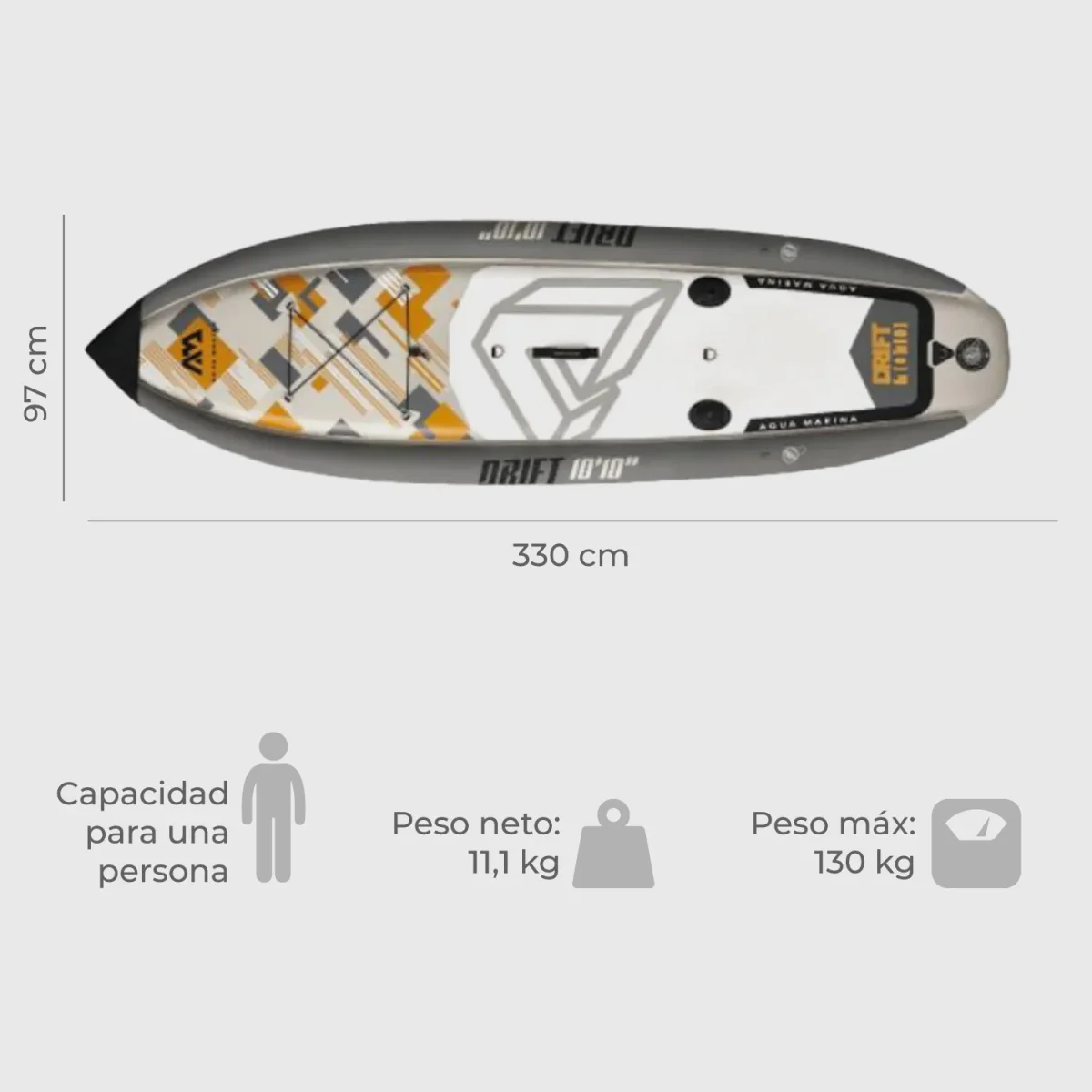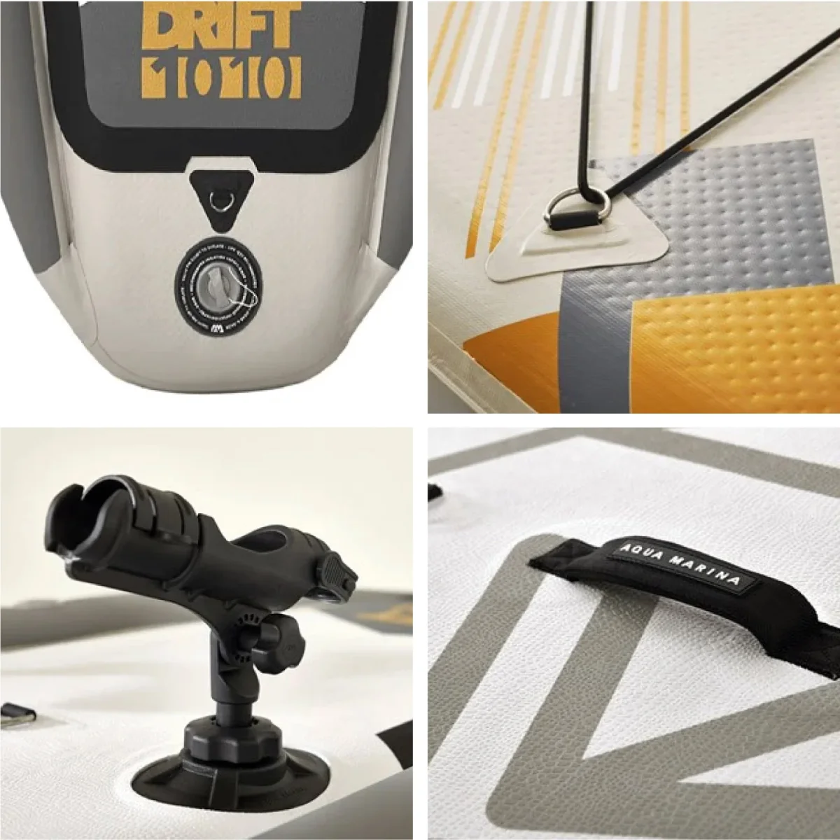 El contorno del diseño del riel de doble cara del Drift ofrece la máxima estabilidad para una experiencia ideal de remo y pesca. Las características incluyen una almohadilla de tracción de plataforma completa para mayor comodidad, dos soportes para cañas de pescar.