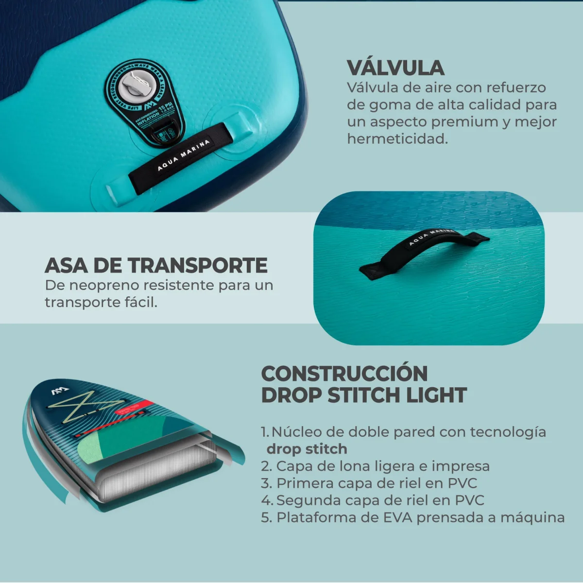 - Equipado con la tecnología de su material DROP STITCH de última generación y soldadura por fusión por calor.
