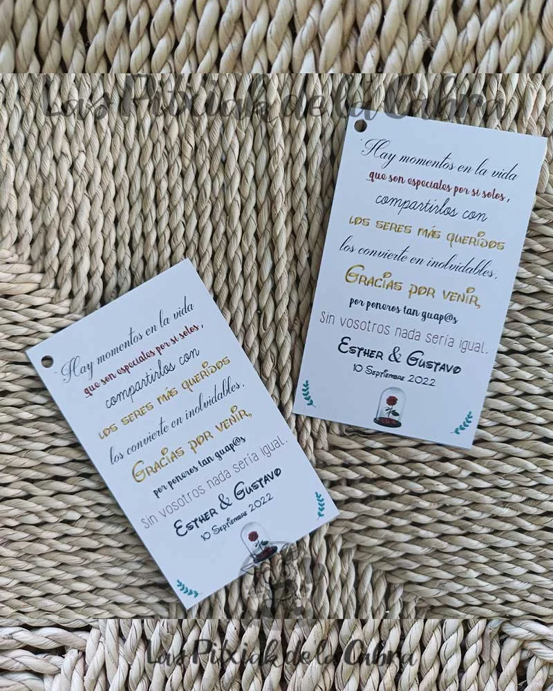 ¿Sabías que…? Este modelo de Tarjetas Agradecimiento Bella y Bestia fue una creación para ellos, fueron los primeros novios para los que diseñamos esta tarjeta. Es decir, que aunque en la web veis modelos limitados, todo lo que soñéis, para vuestra boda, bautizo, comunión, cumpleaños o cualquier otro evento, nosotros lo haremos posible. Si tú puedes soñarlo nosotros lo plasmaremos en papel.