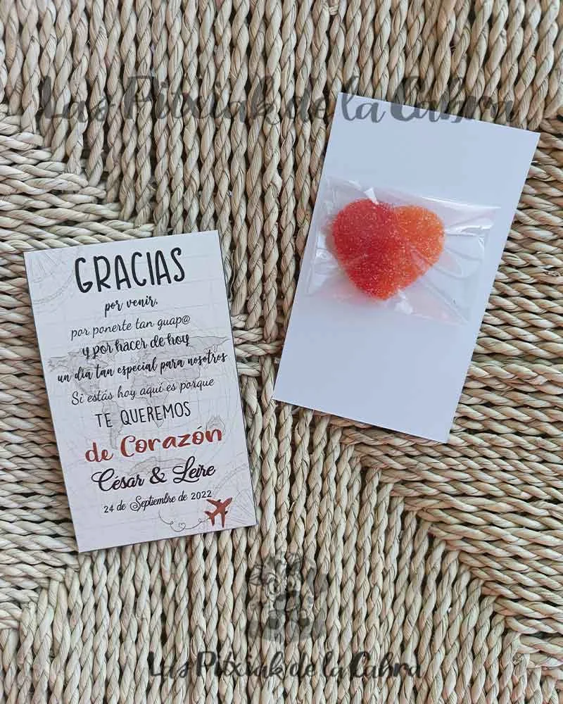 Si queréis podemos enviar la tarjeta suelta o con una gominola en estuchado individual o una piruleta.