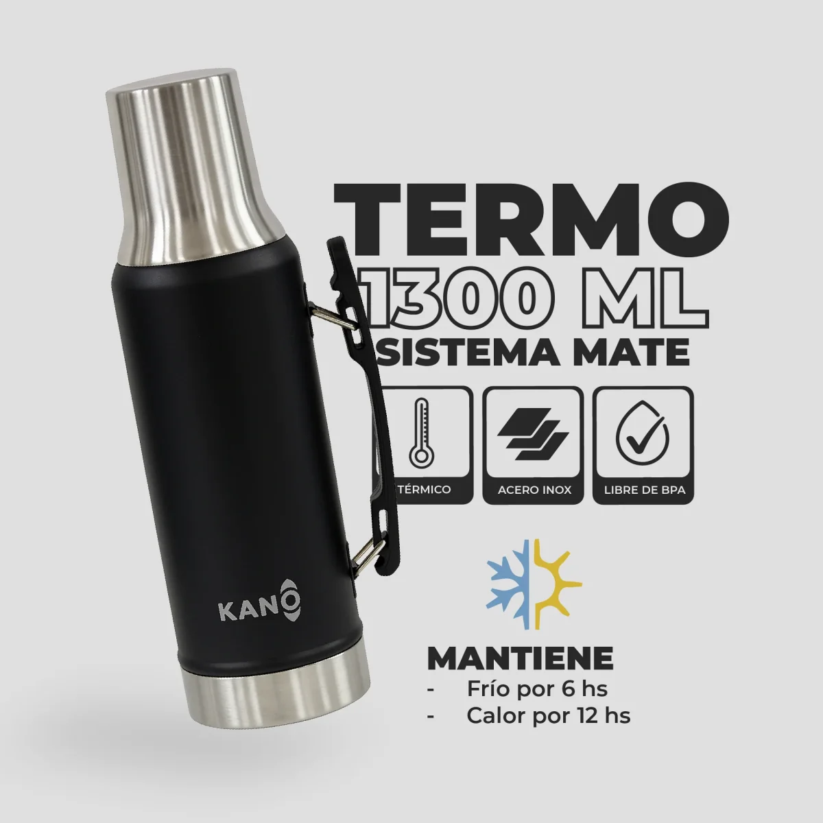 Lleva tu mate, café o agua a donde quieras con el Termo de 1300 ml con Sistema Mate by Kano. Mantiene el calor por 12 horas y el frío por 6, tiene tapón cebador preciso, tapa que se hace vaso o matera y es 100% a prueba de fugas. No guarda olores ni sabores, es apto lavavajillas y súper práctico con su mango plegable. Un termo pensado para ti, que necesitas confianza y comodidad en cada salida.