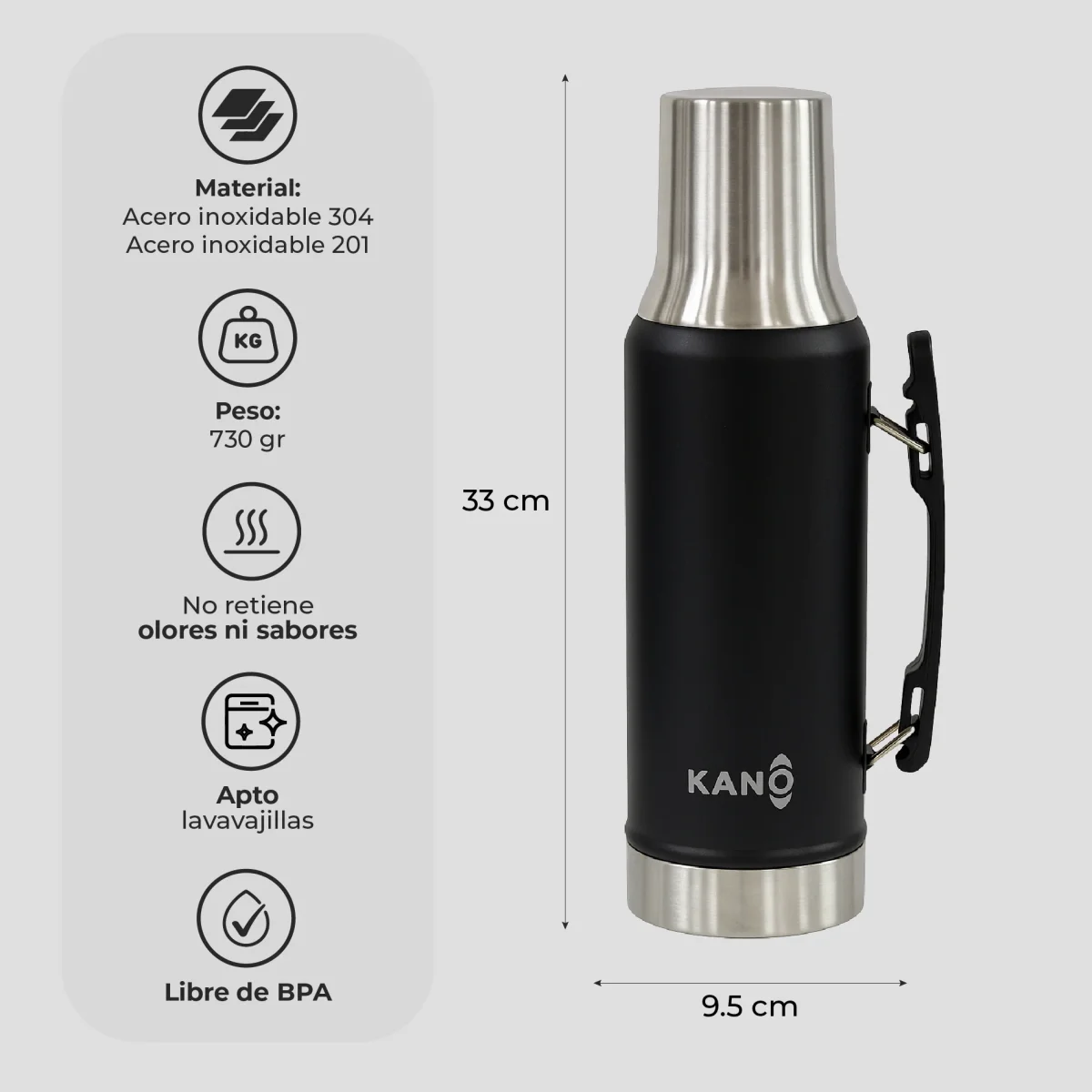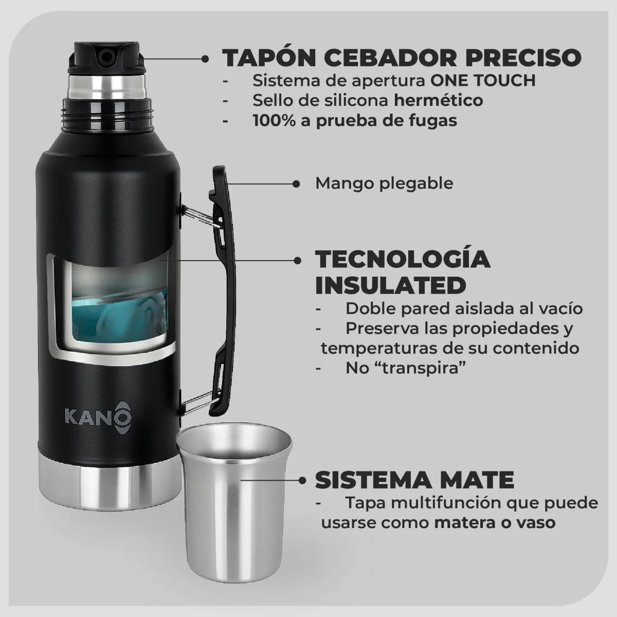 • Diseño insulado: la temperatura del interior no se transfiere al exterior, evitando que el termo “transpire”.