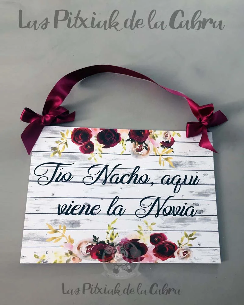 Los carteles de aquí viene la novia, se utilizan en la ceremonia para que los pajes o damitas anuncien la llegada de la novia, del novio o lleven alguna frase graciosa.