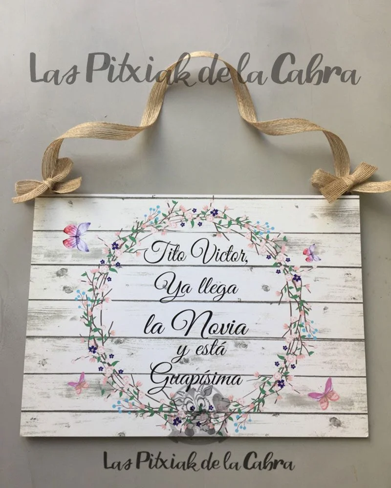 Los carteles de aquí viene la novia, se utilizan en la ceremonia para que los pajes o damitas anuncien la llegada de la novia, del novio o lleven alguna frase graciosa.