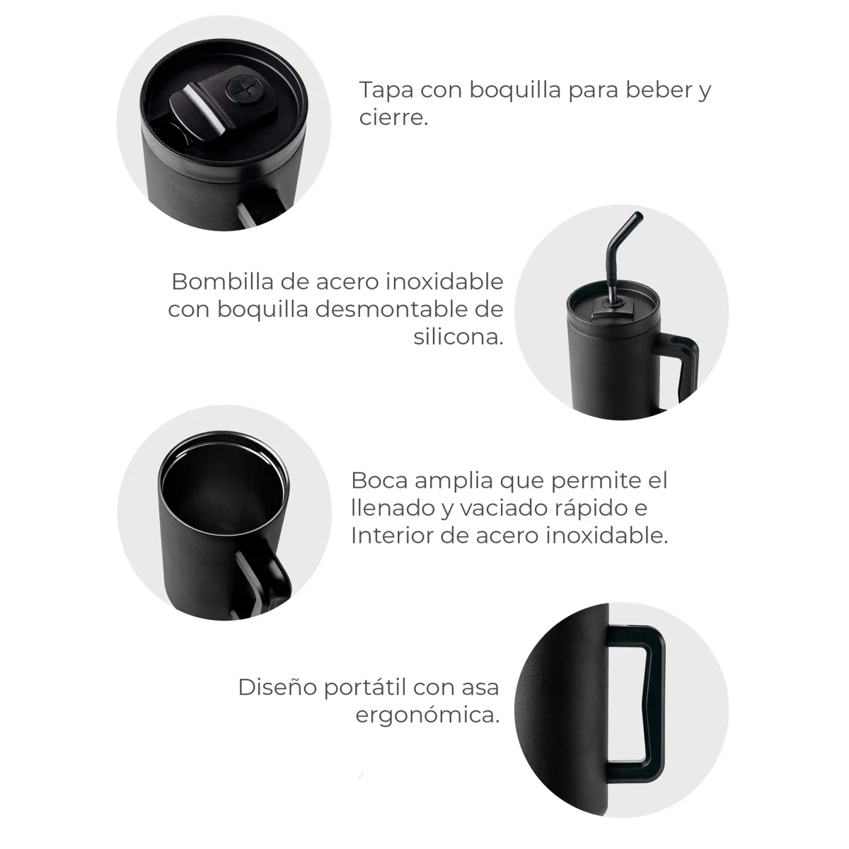 Cuenta con una bombilla con boquilla de silicona, clave para hidratarte de manera fácil y rápida. Su forma es ideal para trasladar de manera práctica y sus ocasiones de uso son super versátiles: Puedes llevarlo cómodamente en el portavasos del automóvil, ya que es compatible con la mayoría de ellos. Además, es perfecto para usar tanto en el entorno de trabajo o estudio como en tus momentos de aventura, como acampadas, picnics, excursiones y caminatas, asegurándote siempre de mantener la temperatura ideal de tu bebida.