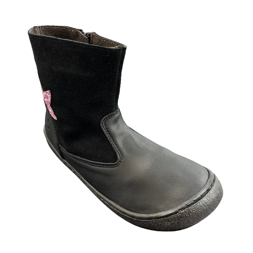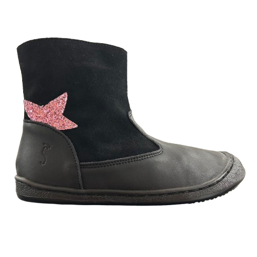 Están fabricadas en cuero y serraje de alta calidad, materiales suaves, resistentes y transpirables que aportan confort y durabilidad. Su diseño moderno en color negro incluye una media estrella de lentejuelas en el lateral, ofreciendo un toque divertido y elegante que gusta a los más pequeños.